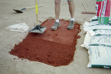 Since bull pens are often located on side warning tracks, extra maintenance is required. Softball and baseball pitchers and batters dig their feet in to anchor themselves for play, which always results in a low worn away area next to plates. To repair, we must use mound clay, such as Mar Mound Clay, packed into that low area with a tamper. (see image 1-3 on right)