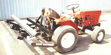 One of the most economical and best designed groomers on the market today, is the Rahn Groomer, which has an adjustable leveling bar, adjustable slope pitch, and foldable grooming options that can be used simultaneously by folding down or up the desired grooming option, such as steel teeth for initial scarifying, spring tines for normal grooming, and a broom for the finish drag. A 3pt hitch version is available for use on any small, preexisting tractor with turf tires. (see image 1-7 on right)